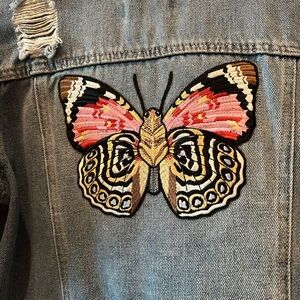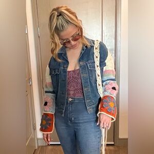 RSQ denim jacket with crocheted granny square sleeves. Free People inspired. Hand crocheted and sewn sleeves. Butterfly patches, including huge one on the back. Heart/eye beaded patch. One of a kind. Groovy and made with lots of love. Women’s size small. ✌️💕🦋