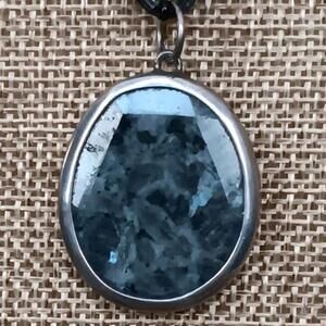 Pendant: Features a large, oval-shaped gray feldspar (sometimes identified as chalcedony or labradorite) gemstone set in .925 sterling silver.