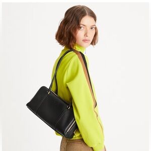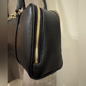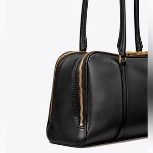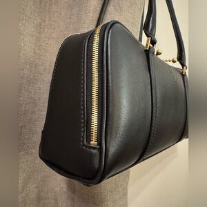 Elegant black satchel. Sleek design with gold accents. Perfect for any occasion.
