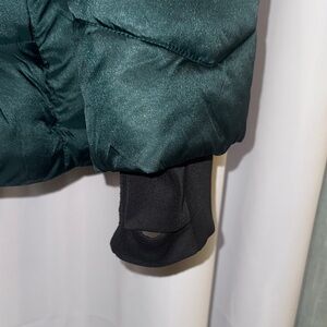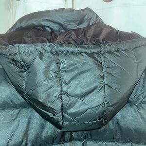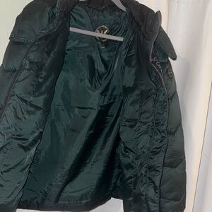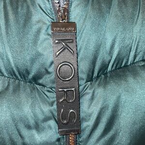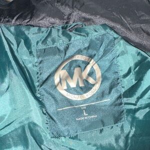 Stay warm and stylish with the Michael Kors Women's Iridescent Green & Black Puffer Jacket. Features Chevron tailing down sleeves, detachable hood fully zippered with thumb holes for hands do added warmth inside adjustable toggle switch & front zippered pockets. Perfect for chilly days, this jacket offers both comfort and elegance. Gentle used condition.