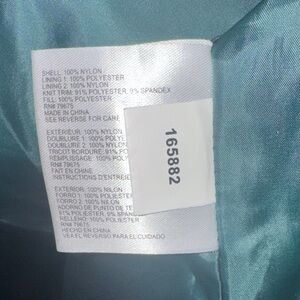 Fabric: Nylon and polyester lining and shell very warm less than 30 degrees.