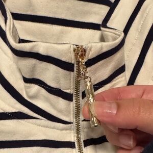 Stylish long sleeve dresswith navy and white stripes. Features a zip-up front and textured sleeve details. Plastic still on zipper. Beautiful detail on sleeves. New without tags