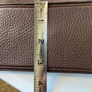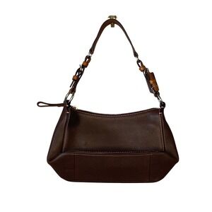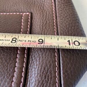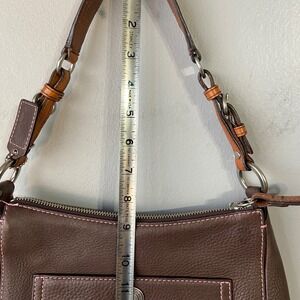 Carry your essentials with sophisticated charm in this Coach brown leather shoulder bag. Crafted from supple, pebbled cowhide, this handbag offers a luxurious feel and a timeless aesthetic. The delicate pink stitching adds a subtle feminine touch, beautifully contrasting with the rich brown leather. A convenient front pocket provides quick access to your phone or keys, while the secure zippered main compartment keeps your belongings safe. The smooth, coral-colored interior boasts an interior slip pocket, perfect for organizing smaller items. Elevate your everyday style or complement your evening look with this versatile and elegant accessory. Ideal for brunch dates, shopping excursions, or casual dinners. Flaw: there are a couple of nicks on interior edge of strap. See pics. Otherwise, excellent condition.