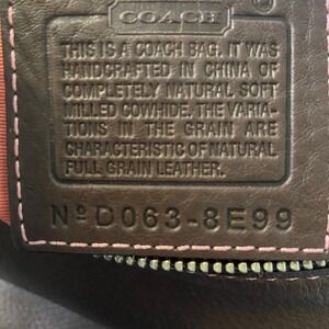 Keywords: Coach handbag, Leather purse, Women's shoulder bag, Brown bag, Pink accent, Pebbled leather, Everyday purse, Chic accessory, Designer handbag, Fashion bag, Small purse, Stylish tote