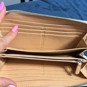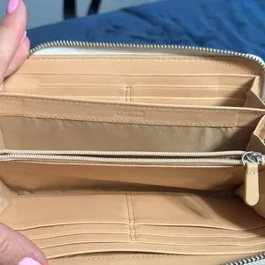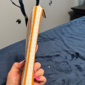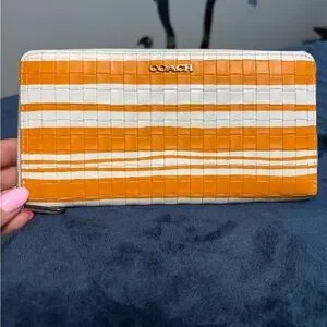 Authentic Coach zip-around wallet in orange & white woven leather.