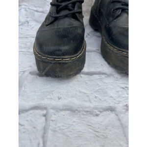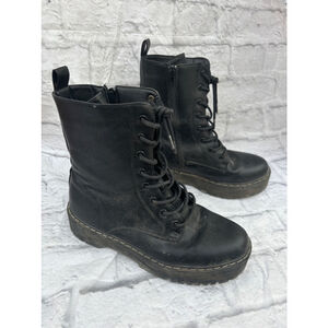 Pre-owned Unlisted black platform boots, size 10M. They feature lace-up fronts and side zippers. The boots show signs of wear, including scuffs and dirt on the soles and some minor scratches on the leather. The overall condition is good, but reflects previous use. See photos for accurate condition.