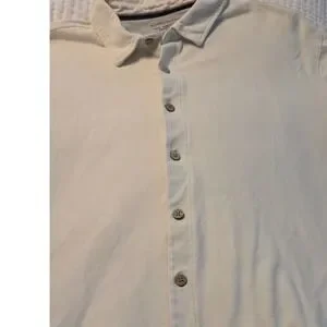 Weatherproof Vintage men's short sleeve button down shirt in a size Large. This classic beige shirt features a collared neckline and a full button front closure with wooden-style buttons. The hem of the shirt and the cuffs of the sleeves reveal a subtle patterned fabric detail.