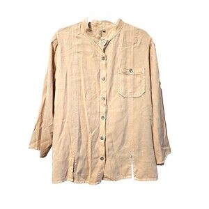 The product is a women's shirt from Pakistan by the brand Ethnic, made from 100% Tencel material that gives it a linen look. This beige shirt is in size Large and is designed specifically for women. Made in Pakistan, it offers a traditional yet modern style perfect for unique clothing options.