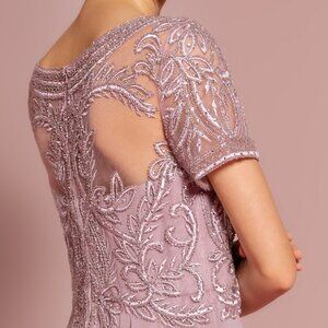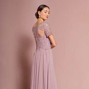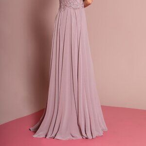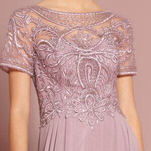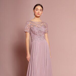 NEW LONG CHIFFON A-LINE DRESS WITH CAP SLEEVES EMBROIDERED WITH LACE GL2683