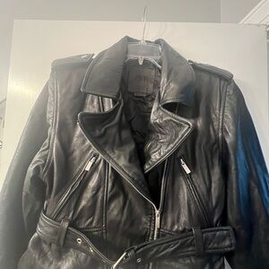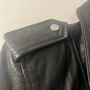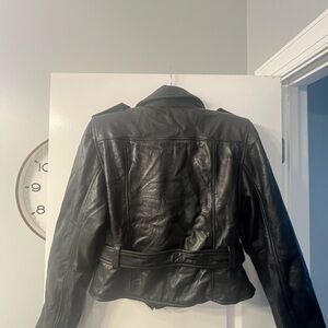Stylish black leather jacket. Features a belted waist and zippered pockets. Perfect for a chic look.