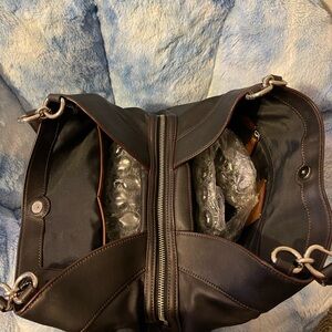 Chic Coach shoulder bag with textured design. Features black and brown tones. Ideal for everyday use.