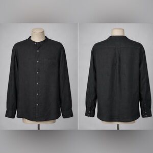 This men’s black linen shirt features a clean, modern silhouette with a band/mandarin collar, long sleeves, and a relaxed yet refined fit—perfect for warm weather, casual wear, resort styling, or elevated everyday outfits.