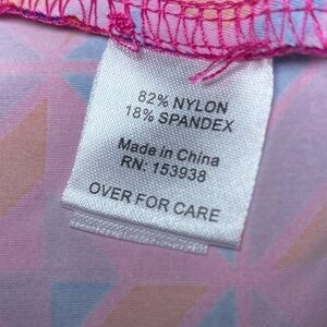 Bright pink top with orange geometric pattern. Soft and stretchy fabric.