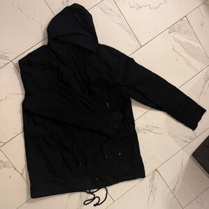 Sleek utility jacket with hood. Features drawstring details and front pockets. Ideal for everyday wear.
