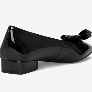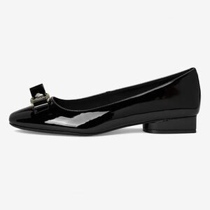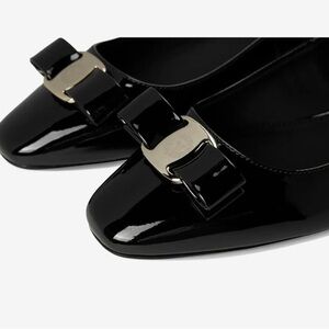 Elegant black heels with a glossy finish. Features a stylish bow and silver detail. Perfect for any occasion.
