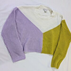 Trendy Colorblock Sweater - Cream, Purple, Yellow Crop Women's Large