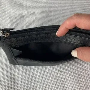 1 front snap pocket with 10 card slots, 1 clear ID holder, and 1 slip pocket Pebbled leather