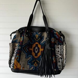 Keywords: boho tote bag, aztec print bag, tribal woven bag, fringe tote, leather accents, moon charm bag, duffle bag, women's tote, travel bag, everyday bag, statement bag, unique handbag, ethnic pattern, bohemian style
