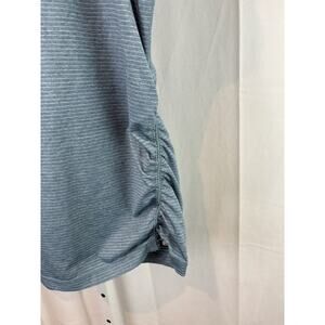 Scoop neck, v-back, dolman short sleeves, pullover style, gently shaped with ruched sides. Lightweight performance fabric in a subtle stripe. Blue-gray.