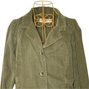 Free People Twofer Orly Cord Heritage Jacket with Button-Front, in Greyed Olive, Size XL. Attached underlay with Multiple Hook Closure, Stitched Cuffs, and Pockets. Slim fit.