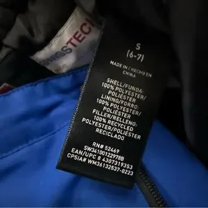 Stylish Swiss Tech jacket. Features black and blue colors. Perfect for outdoor activities.