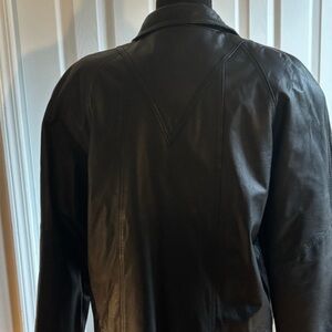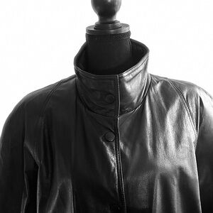 Sleek black leather jacket. High collar with button closure. Perfect for stylish layering.