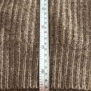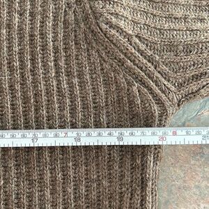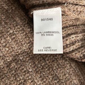This is a large lambswool pullover sweater by Cabela’s. It has reinforced shoulders and elbows. No issues. Measurements in photos. Brown