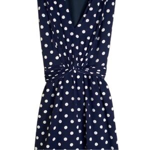 Elegant navy dress with white polka dots. Sleeveless and perfect for versatile styling.