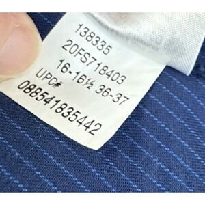 The Van Heusen Button Down Shirt is a stylish and versatile choice for men, featuring a slim fit design with long sleeves and a collared neckline. This shirt is perfect for various occasions, from casual outings to business meetings, and even travel. Made from a blend of polyester, spandex, and cotton, it offers a comfortable and lightweight feel with stretch for ease of movement. The blue striped pattern adds a classic touch to the modern and business-themed design, making it a great addition to any man's wardrobe. Easy to care for with its non-iron and machine washable features, this shirt is a practical and fashionable choice for the modern man.
