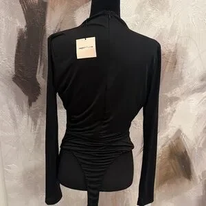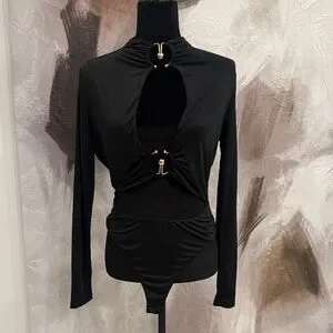 Stylish black bodysuit with unique cut-out design. Features gold accents. Perfect for a night out.