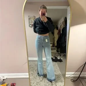 Stylish light blue flared jeans perfect for any casual outing. Comfortable and trendy, these jeans are a must-have in your wardrobe. Button fly, raw hem, white washed denim. Stretchy jeans.