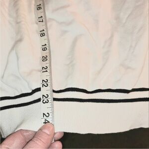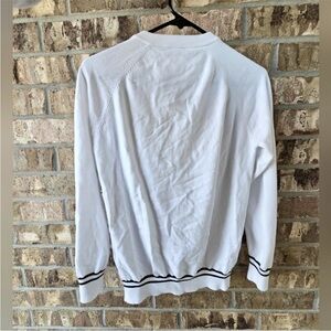 Authentic Balmain Paris white sweater with black logo lettering and signature decorative shoulder buttons. Classic crewneck style with stretch for a comfortable and flattering fit. Timeless designer piece that works for casual wear or elevated styling.
