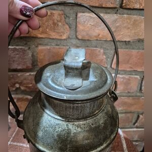 Years of patina on this old milk or cream can. 2 liquid quid quart size. She's got bumps and bruises and dents, but it all makes her that much more pretty! Perfect touch for your farmhouse kitchen or repurposed in a cottage garden. Base is 5.5" wide, about 8" from bottom to lid top.