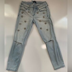 Chic light blue jeans featuring silver embellishments. Ideal for a stylish look. Super cute and chic stretch. Note see in pic a slight dirt scuff haven’t tried to deep clean. Dress up or casual wear. Stretchy jean