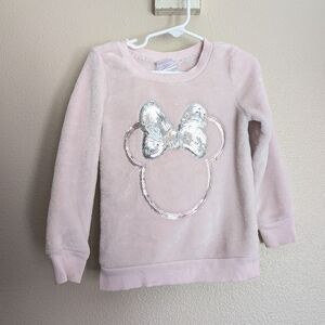 Plush pink Minnie mouse sweatshirt. Pullover crew neck, size 4T. Sequin Minnie Mouse outline on the front. Some light stains on sleeve cuffs. Smoke free home.