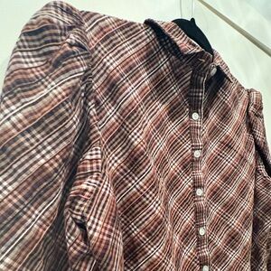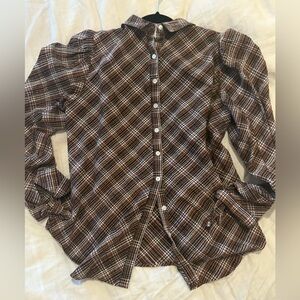 Veronica Beard Isabel Plaid Brown Grey Black White Women's Poof Sleeve Mock Neck Top