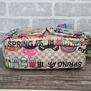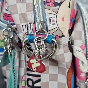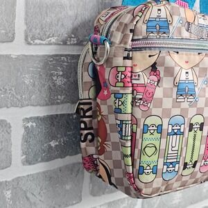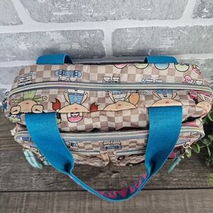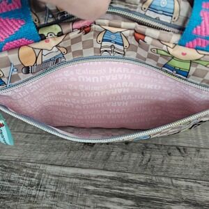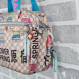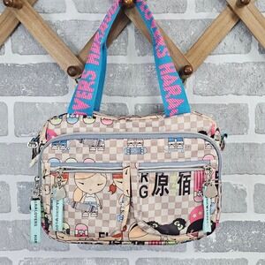 Graphic print shoulder bag by Harajuku Lovers with checkerboard design, cartoon characters, and heart charm hardware. Strong Y2K, Harajuku, anime-inspired, skater girl vibe. Fun statement bag for casual outfits or collectors.