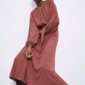 Zara rust pink peasant style midi dress featuring puff sleeves, a belted waist, pleated detailing, and a back tie neckline. This boho cottagecore style dress has a relaxed shift silhouette with front pockets and a flattering midi length. Lightweight and flowy, perfect for fall, cottagecore, boho, or casual everyday wear. Size small. Used in good condition. Fabric tag is missing.