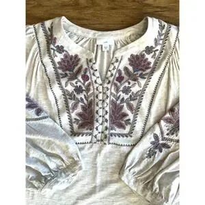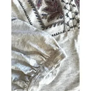Beautiful Heathered cream background (I would call oatmeal) with floral embroidered sleeves and front yoke