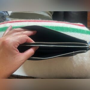 Sleek black leather design. Perfect for everyday use. Features a stylish chain strap.