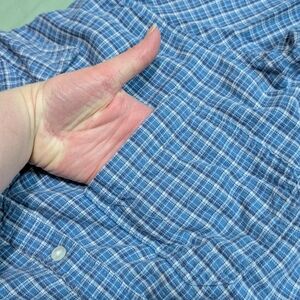Stylish blue checkered shirt. Ideal for everyday wear. Lightweight and breathable. Has one front pocket and 2 button closure on cuffs.
