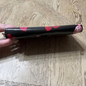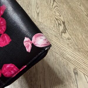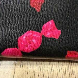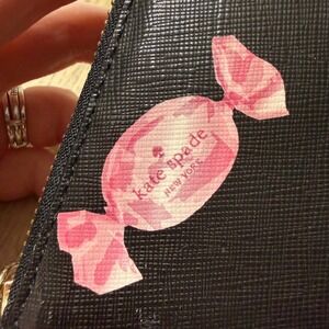 Carry your essentials in sweet style with this Kate Spade wallet. The vibrant black background is adorned with playful pink and red candy prints, featuring the iconic Kate Spade New York logo on one of the candies for a signature touch. Its sleek zip-around design ensures your cards and cash are secure and organized, while the charming pattern adds a delightful pop to your everyday look. Perfect for adding a whimsical accent to your daily routine or a fun accessory for a casual outing.