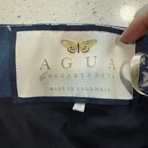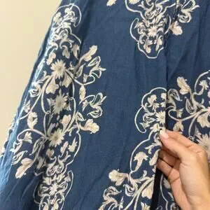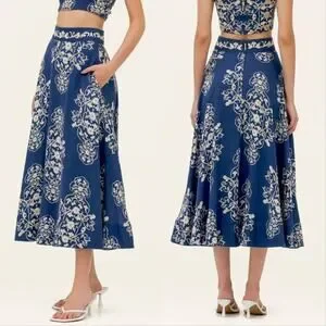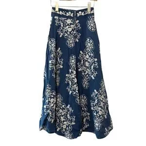 Agua Bendita Bergamota Ribbons Maxi Skirt in Blue. Women's Size XS / Extra Small. Crafted in 100% linen with a flowing maxi silhouette, this skirt features a back zip closure, unlined, denim like finish, and allover embroidery like printed detail. Minor fabric wear. Retail $890.