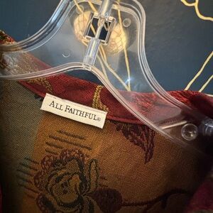 There are no size or care tags. Only one brand tag that says “ All Faithful”. BUT. ( here’s the mystery) if you google search it, you can find Laura Ashley jackets with the same fabric, and even a similar cut. Is it an off brand version of an 80s LA piece? A remnant ? Tag switch? I’ll never know… it adds to the fun of a vintage item!