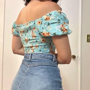 πFloral Ruched Blue Crop Top Size Small