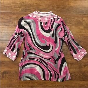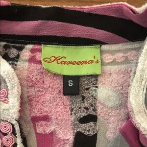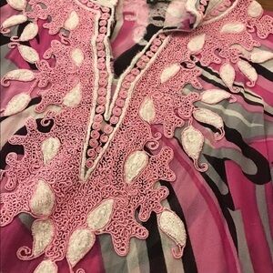 Kareena’s silk embroidered tunic blouse or cover up. Geometric print, detailed embroidered design. Excellent condition. Retails $148 . Size small