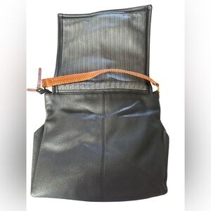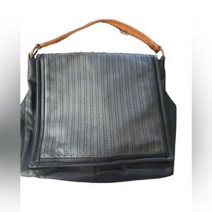 Distressed vegan leather messenger bag featuring a foldover top with a laser-cut design, Braided top handle and an adjustable shoulder strap.