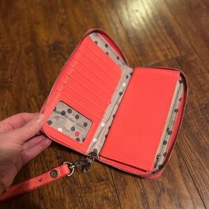 Stylish coral wallet. Features polka dot interior. Multiple card slots. Secure zip closure. Wrist strap included.