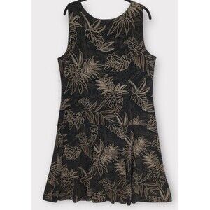 The Chico's 3 Travelers Sleeveless Dress in Women's XL is a stylish and versatile piece perfect for various occasions such as travel, parties, casual outings, and business events. The black dress features a tropical leaf print, round neckline, and a pullover closure for easy wear. Made from a blend of spandex and acetate with a knit fabric type, this knee-length dress is comfortable to wear and has flare accents for added flair. Ideal for the summer, fall, and spring seasons, this dress is machine washable and stretchy, making it a convenient and practical choice for your wardrobe.