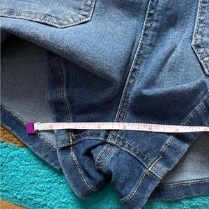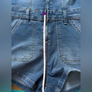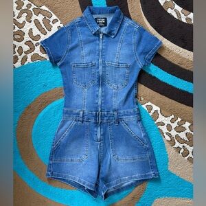 Chic denim romper. Features front pockets and zipper closure. Ideal for everyday wear.